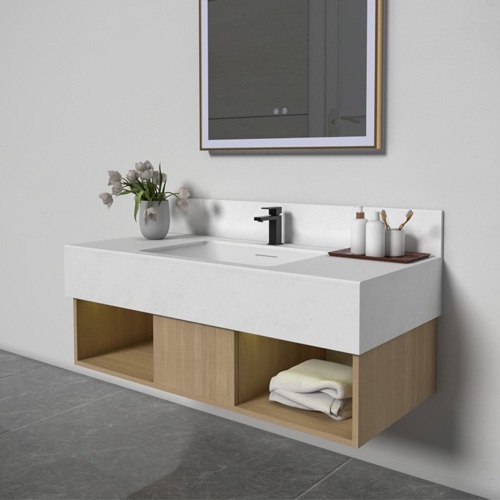 Floating bath vanity with artificial stone top and wood towel cubbies, welcome to inquiry