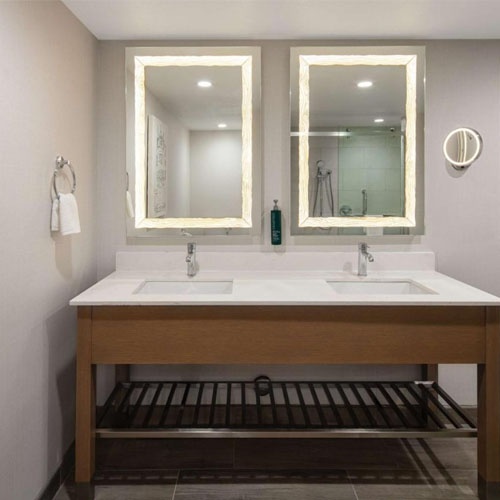 bath vanity shower glass and LED mirror for Doubletree by Hilton in Sacramento