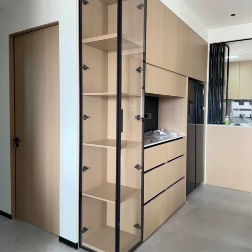 Display cabinet with aluminum glass door combining design of millwork cabinet and clear glass door for visible access