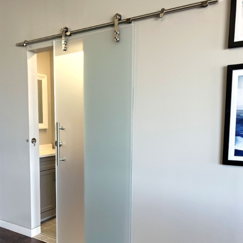 Frameless sliding frosted glass barn door with privacy lock, submit the rough door opening and our team will offer a quote for your project needs